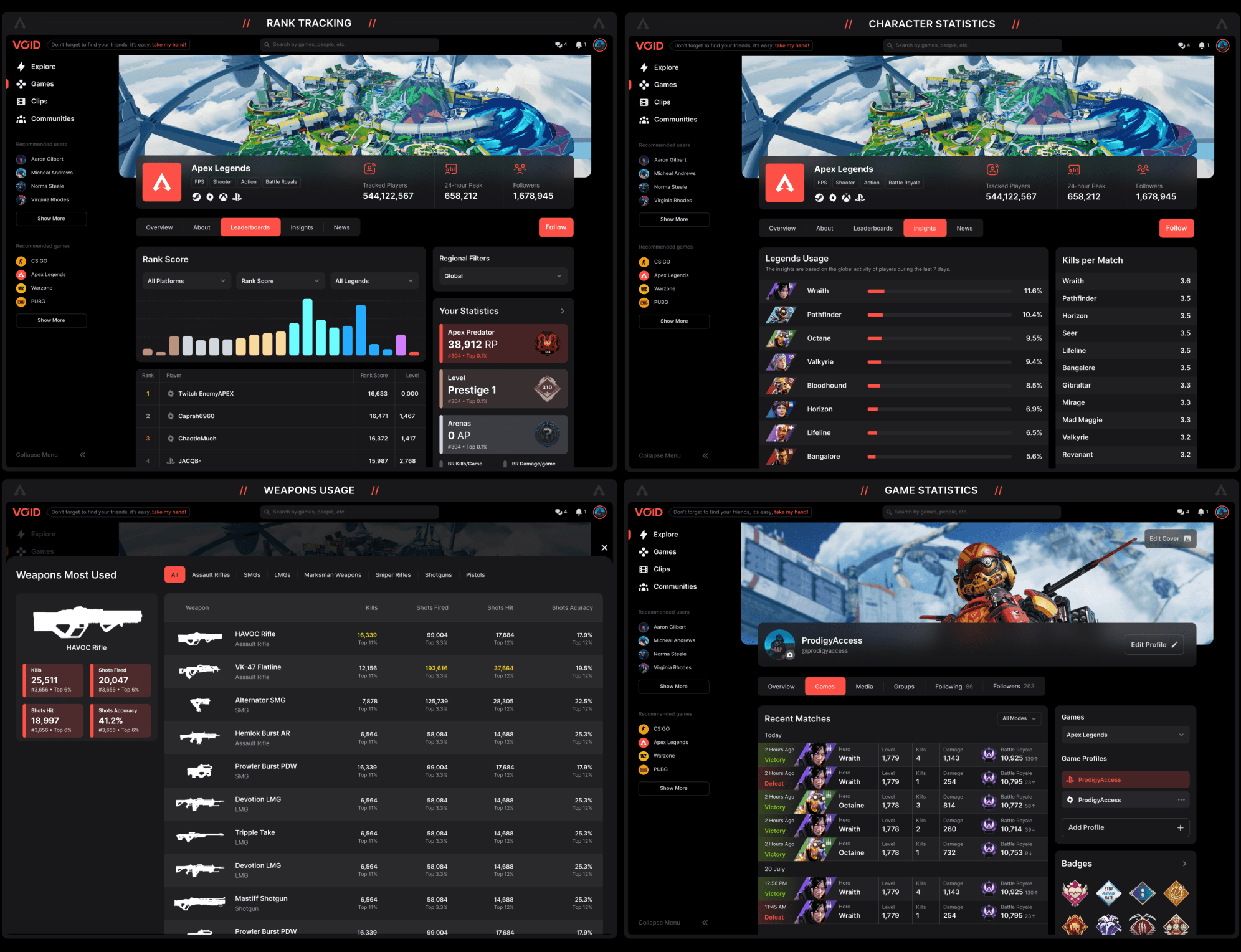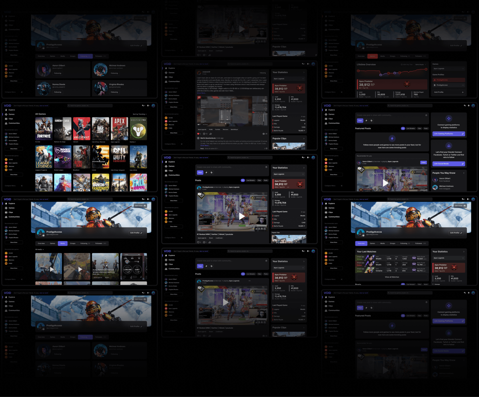 The challenge in Void's UI was twofold - creating a vibrant social hub and adapting to the unique statistical needs of different games. Our design journey involved harmonizing these elements, ensuring each game's stats were meticulously integrated, providing a personalized yet unified gaming experience.