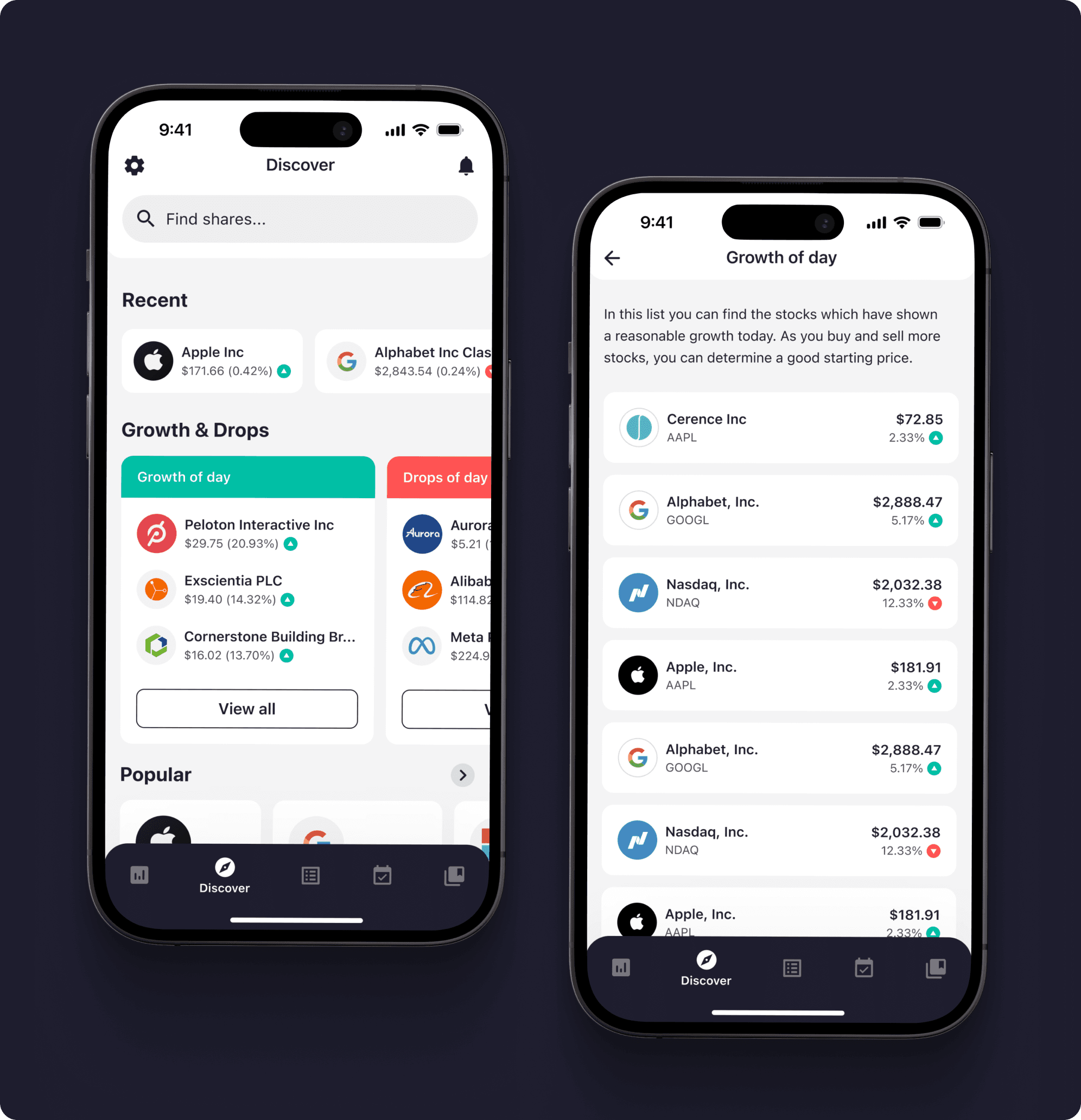 On the Discover section, users can explore daily market trends such as hikes and drops, popular stocks, and most active companies. They can check the proposed compilations to analyze the market before making their own investment decisions.
