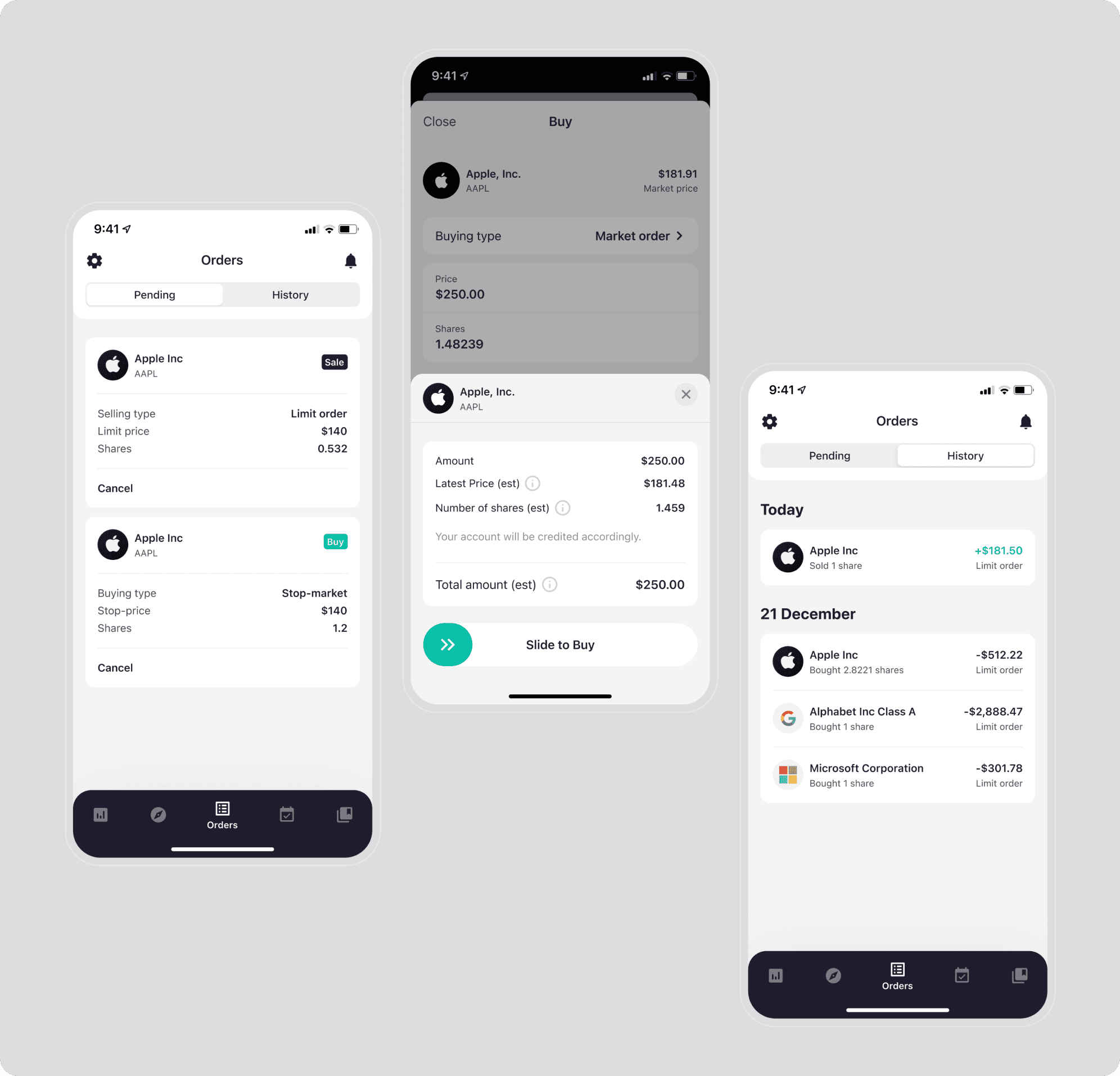 Select from four different types of orders and determine either a monetary value or a share quantity, depending on what your budget permits. Review all order details thoroughly and ensure they're clearly understood prior to finalizing.